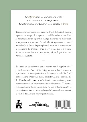 Todos ponemos nuestra esperanza en algo. Si el objeto de nuestra esperanza es temporal, la esperanza también será temporal. Pero si ponemos nuestra esperanza en algo inamovible e inmutable, la esperanza será eterna. En 40 días de esperanza, el autor bestseller Paul David Tripp explora el papel de la esperanza en la vida diaria del cristiano. Tripp nos recuerda que la esperanza no es un sentimiento, ni un objeto, ni un lugar, sino una persona: Jesucristo.